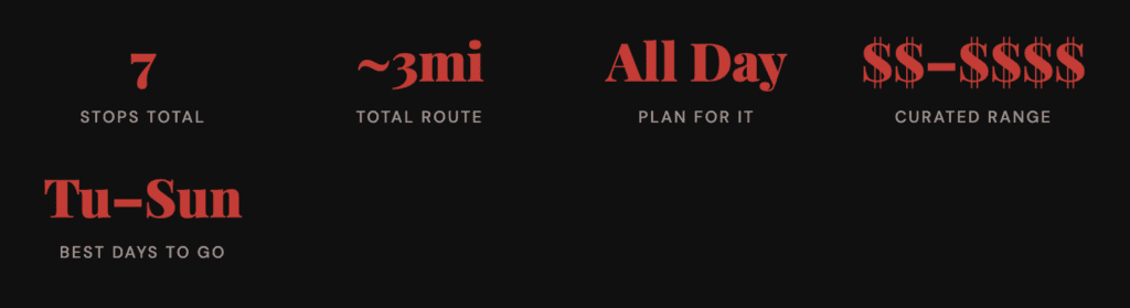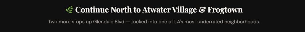 The route runs east-to-west along Sunset, then cuts north up Hyperion toward Atwater Village for a couple of hidden gems. You can do the whole thing in a day, or split it across a morning and afternoon with lunch on Sunset in between.