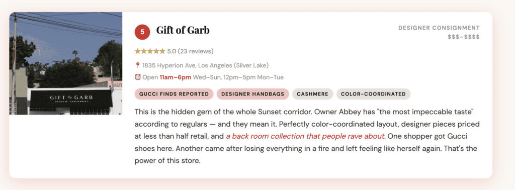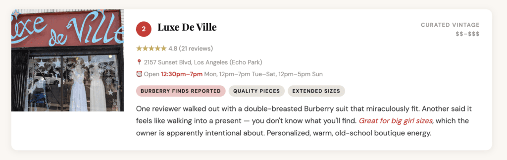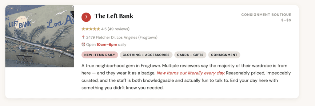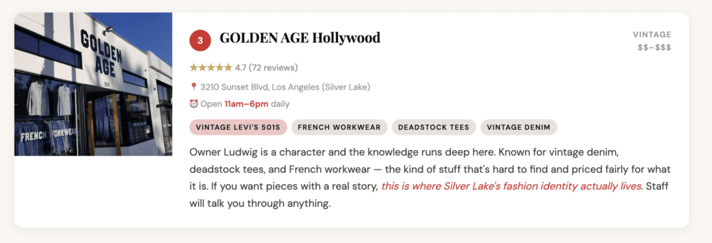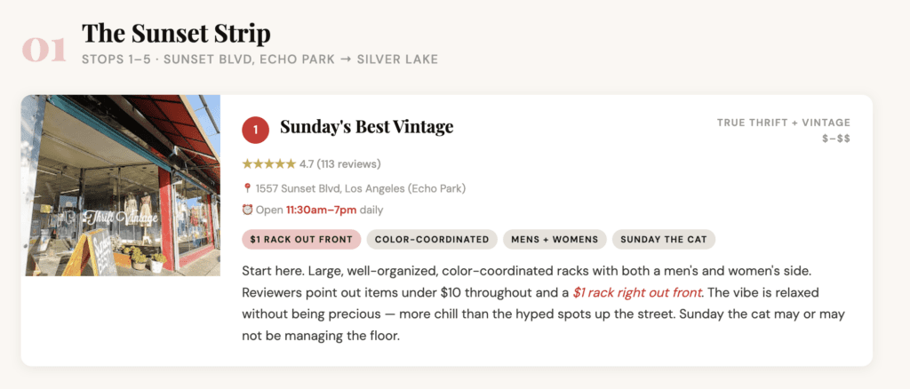 If there’s one thrift corridor in LA that actually lives up to the hype, it’s Sunset Blvd between Echo Park and Silver Lake. You’ve got multiple decades of vintage stacked within half a mile of each other, and the neighborhood’s whole identity is built around the idea that your clothes should mean something. This isn’t just shopping — this is the vibe.