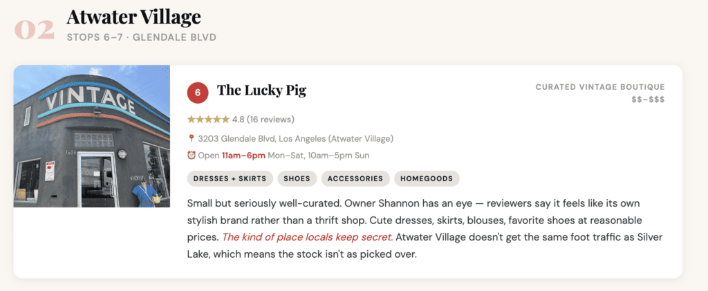 I hope this helps you plan a full day of thrifting in the LA area. When you need to fuel up, Sunset Blvd has you covered — Café Tropical (right on Sunset in Silver Lake) is a 50-year-old Cuban bakery and a neighborhood institution, great for a quick cubano or pastry between stops. Pine & Crane on Sunset is another local go-to for affordable Taiwanese noodles and rice bowls, perfect for a proper sit-down lunch. If you’re doing this on a Saturday, build some extra time to swing by the Silverlake Flea Market (1911 Sunset Blvd, Los Angeles, CA 90026) — it runs Saturdays from 8:30am to 3:30pm, free admission, right at the Echo Park/Silver Lake border. It’s essentially a seventh stop on this route and absolutely worth it.