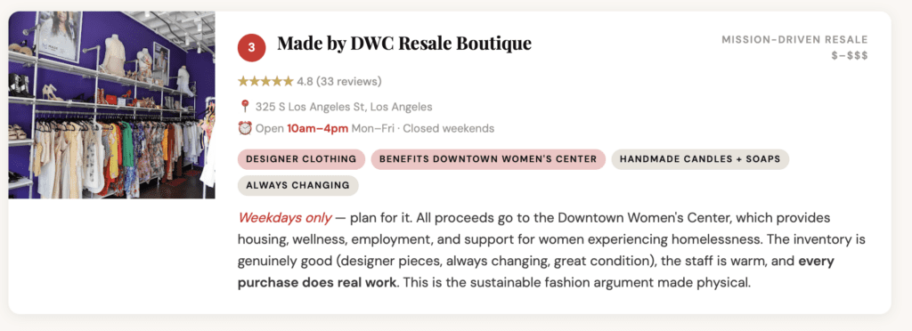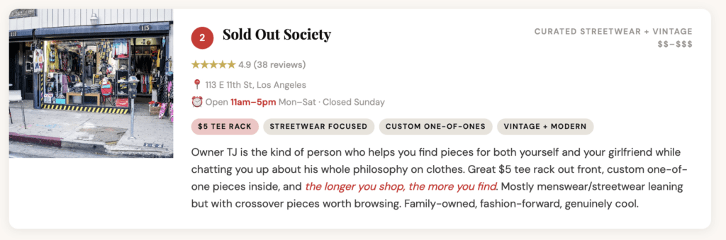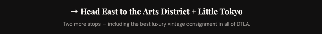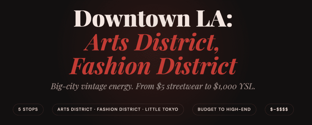 DTLA’s thrift scene is less about a single strip and more about knowing which warehouses and buildings to walk into. The Fashion District bleeds into the Arts District which bleeds into Little Tokyo, and the vintage shops here reflect all of it — streetwear, luxury consignment, mission-driven resale, and everything in between.
