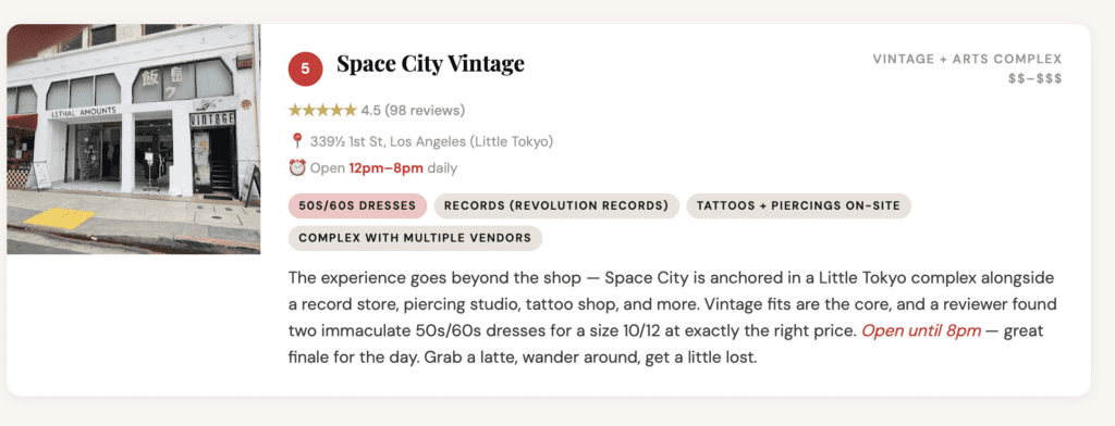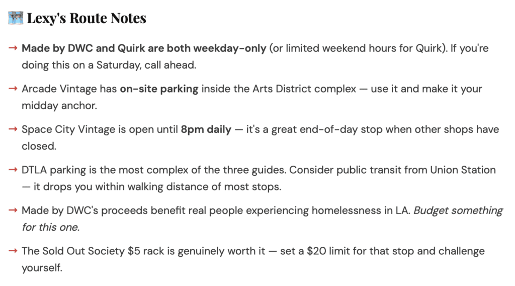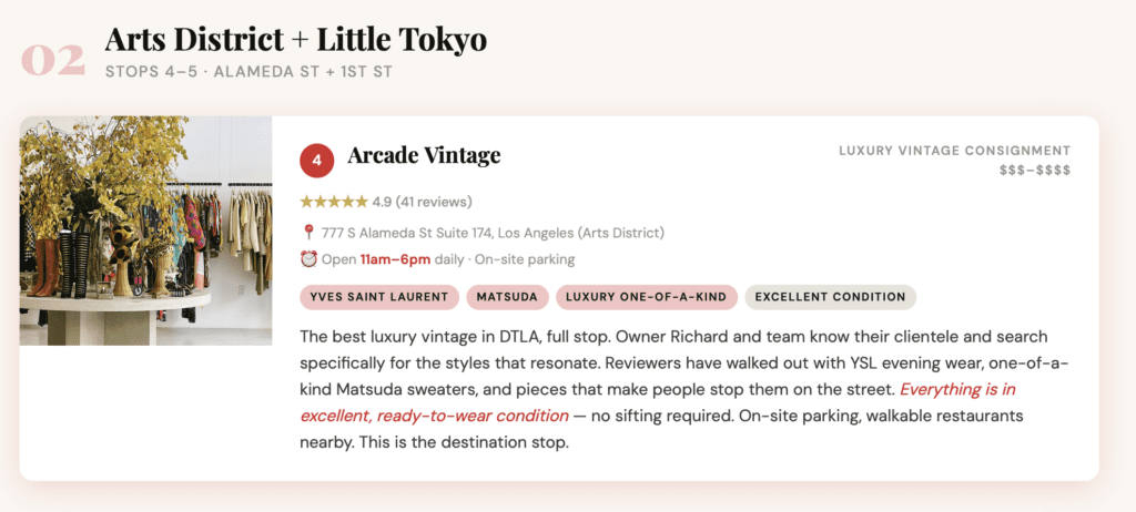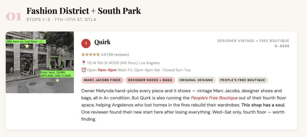 A few of these require a bit of navigation (Arcade Vintage is inside a complex, Quirk is on the fourth floor of a building), but that’s exactly what makes them finds rather than destinations. Budget a full day, plan for parking, and go on a weekday if you can — some of the best spots are weekday-only.