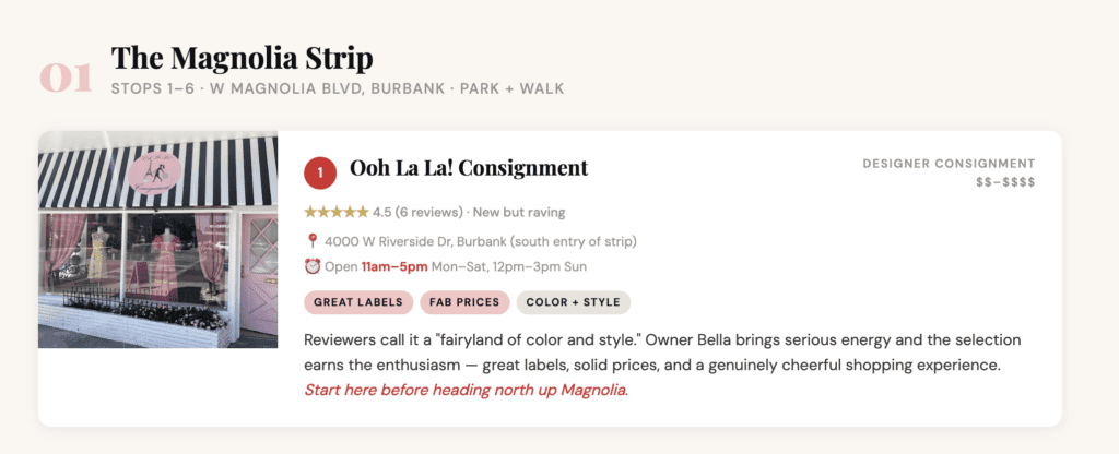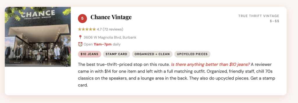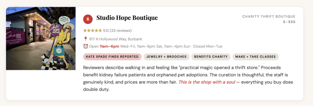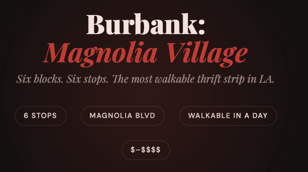 Burbank doesn’t get the credit it deserves. Magnolia Blvd is one of the most walkable thrift strips in all of LA — a concentrated cluster of vintage boutiques, charity shops, and curated consignment stores within literal blocks of each other. You can park once and hit most of them on foot.