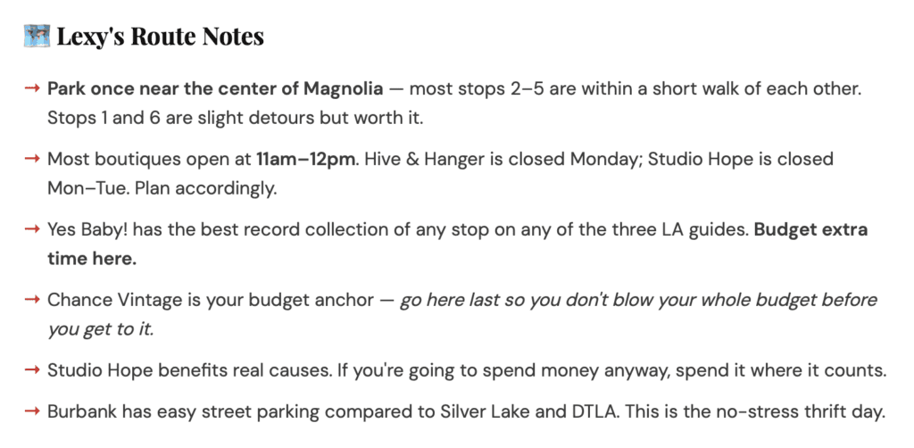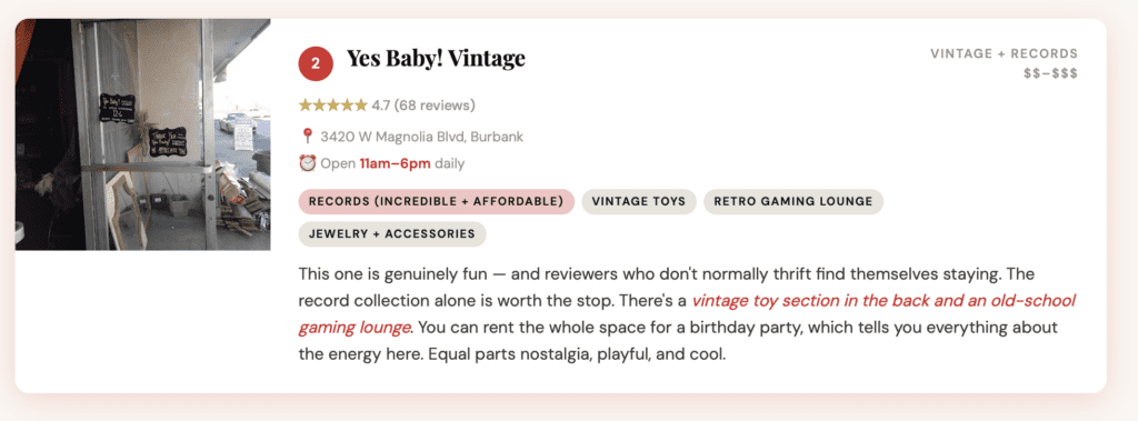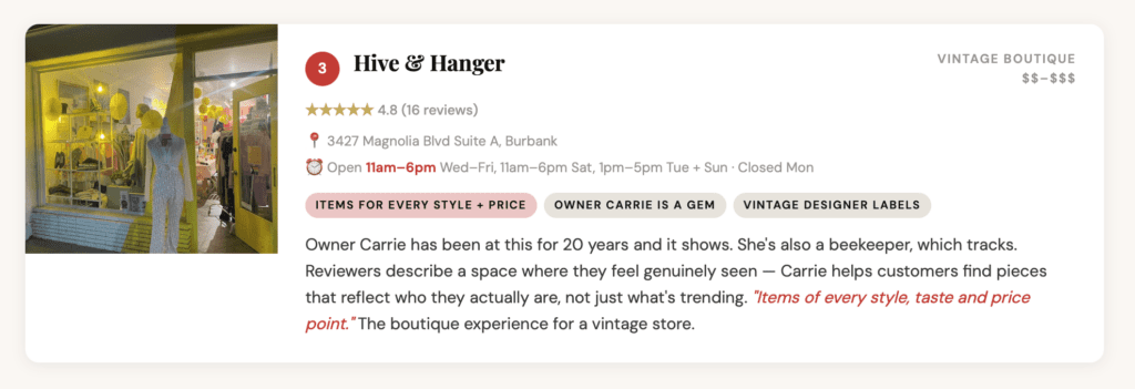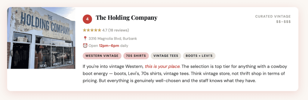 The energy here is different from Silver Lake — less scenester, more genuine. These are shops run by people who clearly love what they do, with loyal local regulars and inventory that ranges from budget thrift to well-priced vintage Western and 70s pieces. Great day trip if you want easy parking and a low-pressure browse.